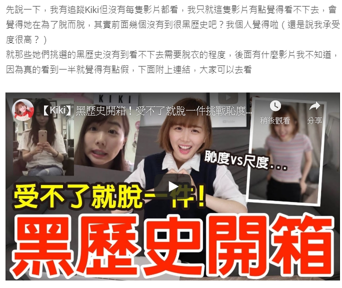 Kiki影片一出,立刻引起不少人關注,同時也有網友在Dcard上發文表示,放出來的影片沒有到黑歷史程度,認為Kiki是為了脫而脫,「挑選的黑歷史沒有到看不下去需要脫衣的程度,後面有什麼影片我不知道,因為真的看到一半就覺得有點假」。