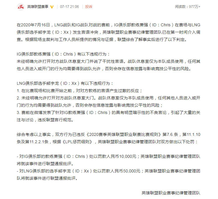 《LNG》戰隊選手 Xx曾在排位賽中嘲諷《IG》戰隊選手 Puff:「盜版打不過正版」,雙方的紛爭因此埋下導火線!16日在對戰前《IG》戰隊的教練 Chris 在《LNG》戰隊的休息室門口說了一句:「正版打野」,而這個稱號其實是許多玩家嘲諷Xx的用語,根據現場工作人員表示,Xx選手甚至衝上前去理論,在後勤人員勸說下才以賽事為重回去休息室,不過Xx選手在賽場中表現依舊不如人意,最終 LNG 慘敗給 IG !