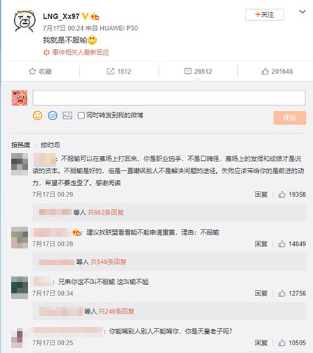 Xx選手在隔日於自己微博上發了一篇:「我就是不服輸」,但隨即遭到大批網友猛烈批評,而他的妻子也轉發微博力挺自家人發文表示:「嗯,還是喜歡我老公這麼剛,就是有點遺憾,怎麼沒用棒子打狗呢?主要是還有很多是非不分的人出來護??算了算了,他們都沒家人我們有啊,也沒啥好生氣的,有些女的真不知道嘴咋那麼臭呢!那我祝你們不孕不育,還子孫滿堂噢!」其惡毒的言論引來更多網友的怒火!
