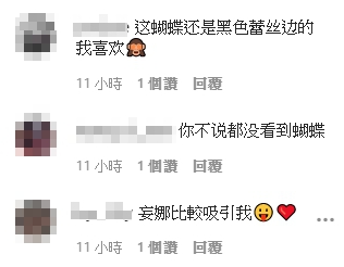 美麗妄娜照片一出,立刻引不少網友按讚,紛紛留言表示,「重點不是在蝴蝶上吧!」、「住在山谷裡的蝴蝶」、「奇怪怎麼看不到蝴蝶...」、「事業有成」、「露長輩我洗翻」、「太性感」、「剛開始只看到黑色的 蝴蝶」、「眼睛不經意一直往下看」。