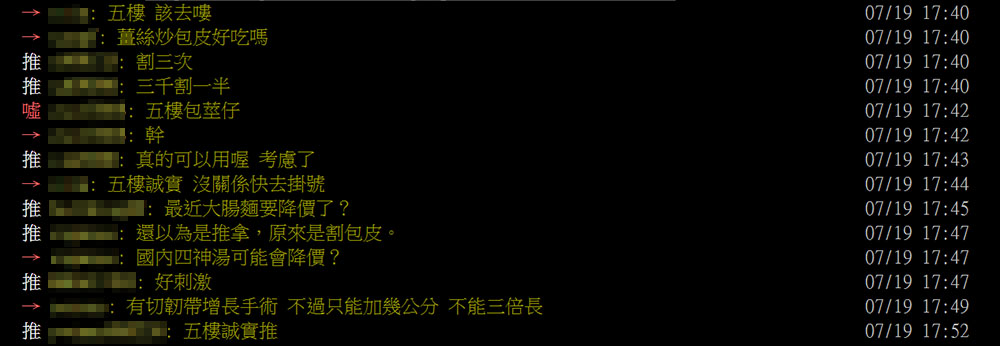 消息一曝光後,有鄉民將其轉貼至PTT上討論,鄉民紛紛留言表示:「五樓包莖仔」、「真的可以用喔 考慮了」、「五樓誠實 沒關係快去掛號」、「好刺激」、「五樓誠實推」。