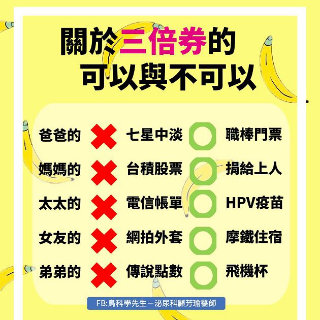 泌尿科醫師顧芳瑜近日在粉絲專頁「鳥科學先生」上分享除了買刈包、皮包,也可以用來「割包皮」,把三倍券投資在最珍貴的GG上,體驗不同的超快感!逗趣詼諧的貼文,讓鄉民紛紛標記朋友,讓他不再有「男」言之癮!