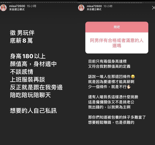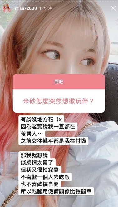 另外米砂也在限時動態中,提到自己想徵玩伴的原因,除了有錢沒地方花以外,其實一直以來都是她在養男人,之前交往時都是由她付錢,但是覺得談感情太累了,又不喜歡一個人吃飯搞自閉,所以乾脆用雇傭關係,「我只是要有個人,讓我帶出去看了心情很好,帥裝飾品,就像背名牌包一樣爽」!