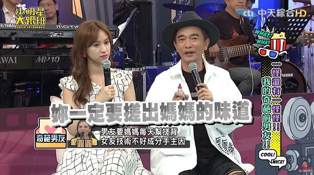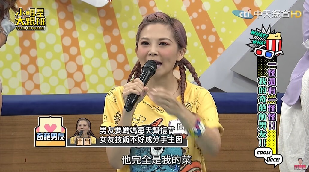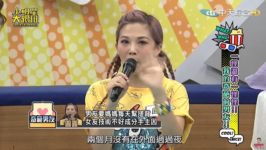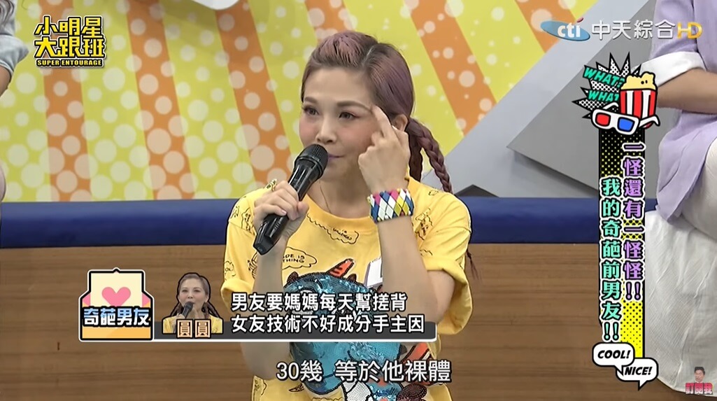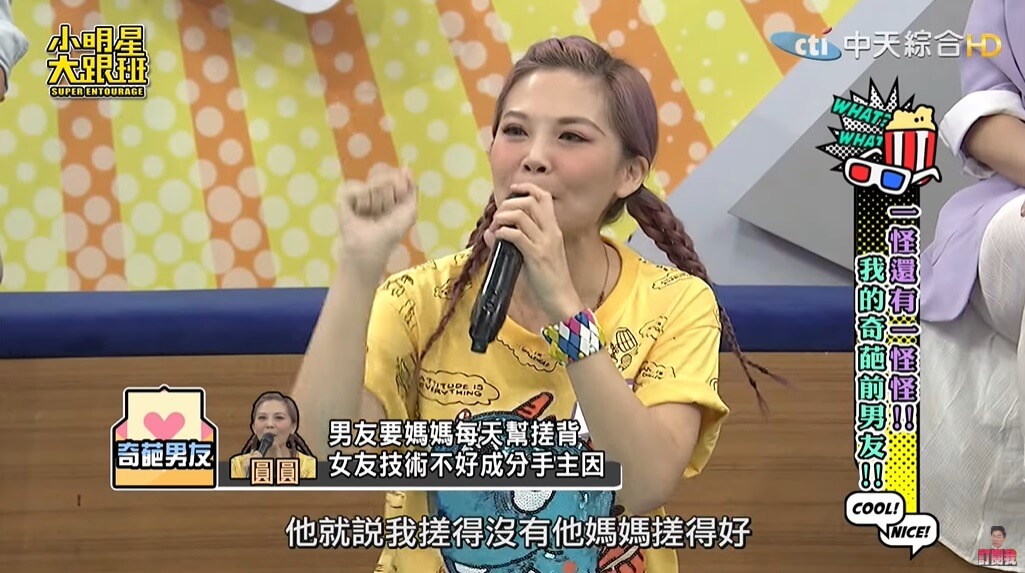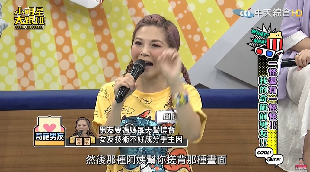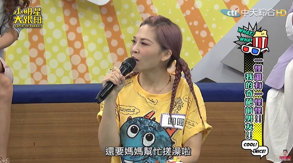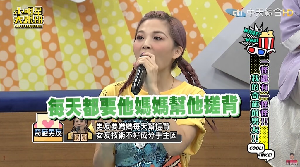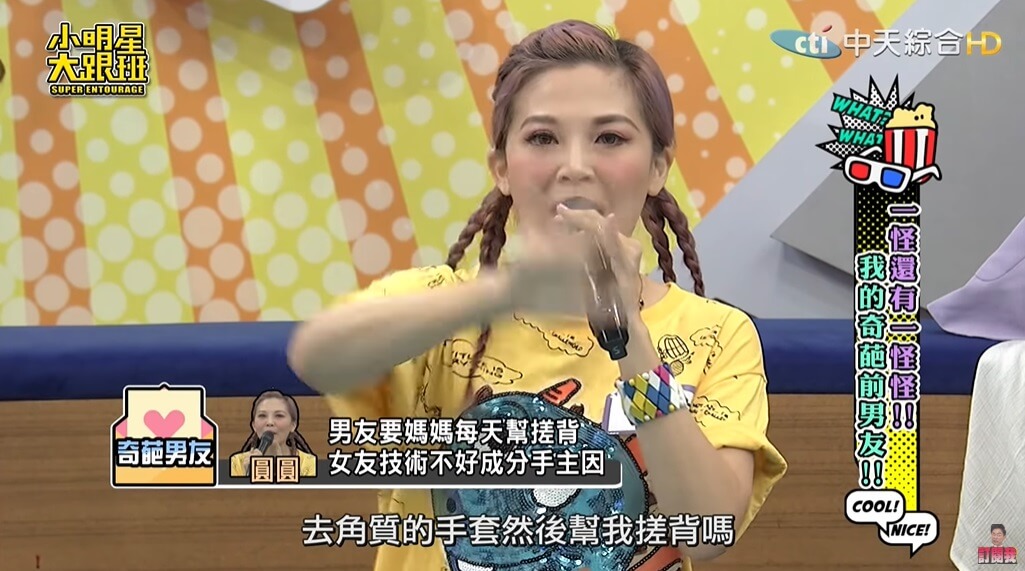 圓圓最近在《小明星大跟班》節目中大方分享自己曾經碰過一任非常奇葩的男友,她透露自己曾交往過一任34歲的男友,「當時兩人一起去礁溪泡湯,對方還準備了泡澡的用具,他拿出去角質的手套,要我戴上幫他搓背」,當下圓圓覺得男友很有情趣,便也沒多想就幫對方搓了搓。