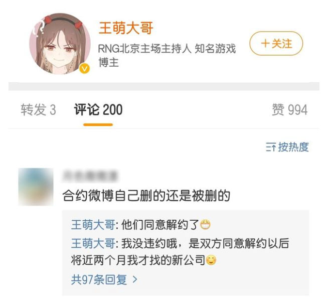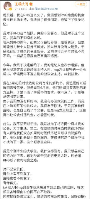 LPL春季賽結束後,王萌就決定與「RNG」戰隊解約,因為自己遭到戰隊方面的惡意冷凍,與當初戰隊承諾會給予資源培養不符,決定離開戰隊。同時王萌也簽下一份兩年內不得轉隊主持的承諾書,不過戰隊方面卻遲遲不將蓋好章的解約書寄還給她,導致王萌面臨了巨大的經濟壓力,不得不先行開始找公會直播,戰隊聽聞消息後則要求對方公會支付違約金,王萌不得已才將此事發布到微博上。