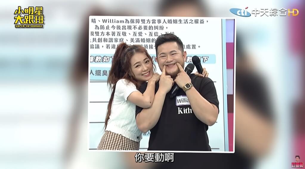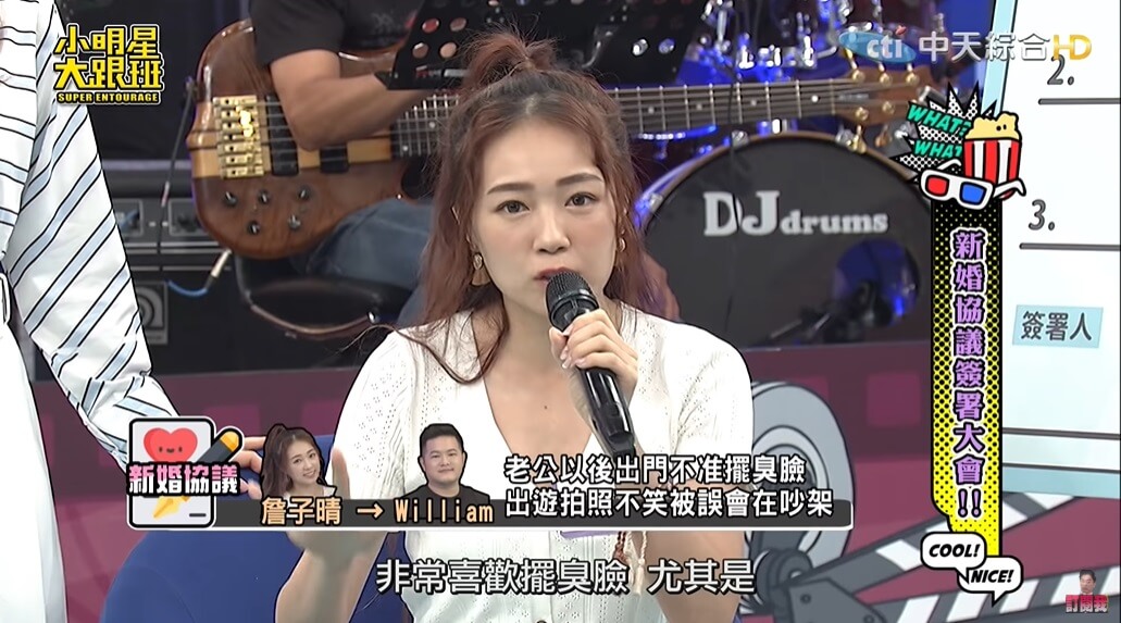丫頭在最近播出的《小明星大跟班》節目中,跟老公王惟立一起參與了「新婚協議簽署大會」的單元,丫頭先是提出了老公出門在外都很愛擺臭臉,拍照時都不笑,很常被誤會他們兩個人是不是在吵架,而且「他在姊妹聚會的時候,也擺臭臉!」讓丫頭無奈的求求老公,「以後拍照的時候可不可以笑一下~」憲哥便提議讓兩人在鏡頭前合照,結果王惟立笑起來超尷尬XD