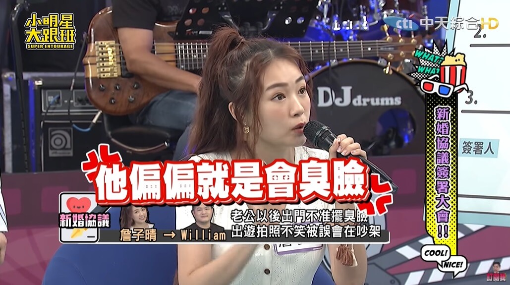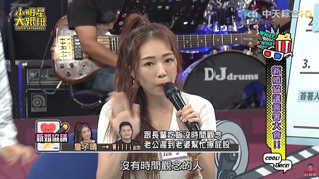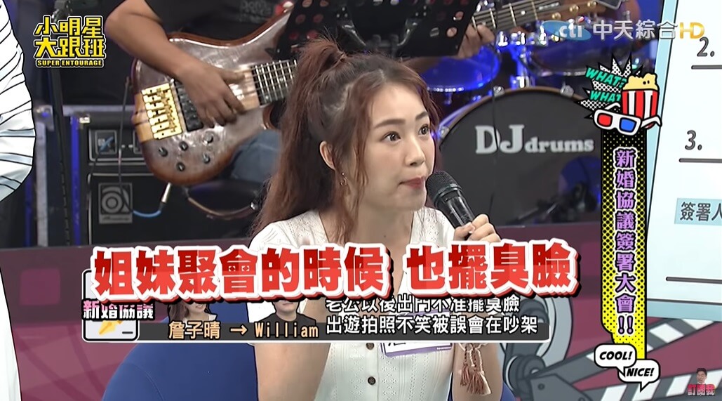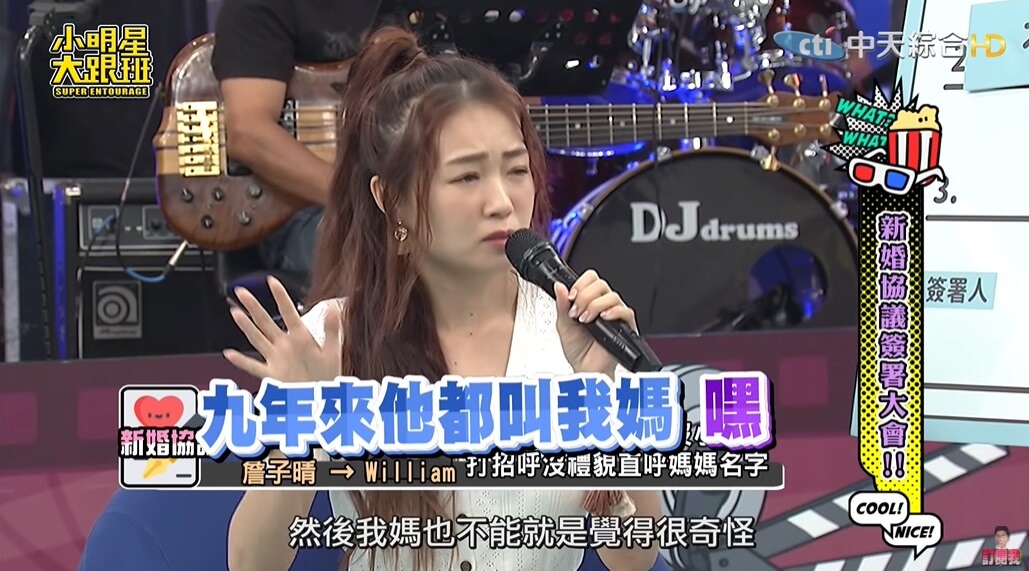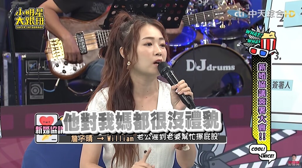 後來丫頭也接著指控老公說,「他是沒時間觀念的人,跟長輩吃飯還遲到,一到場就要趕快跟對方道歉,還被誤會說是因為我動作太慢的關係」,讓丫頭覺得很委屈,並加碼爆料,「他對我媽也很沒禮貌!」丫頭指出,可能老公在美國念書,所以比較洋派,看到我媽就舉手說「嘿~」來打招呼,讓丫頭媽也很納悶!