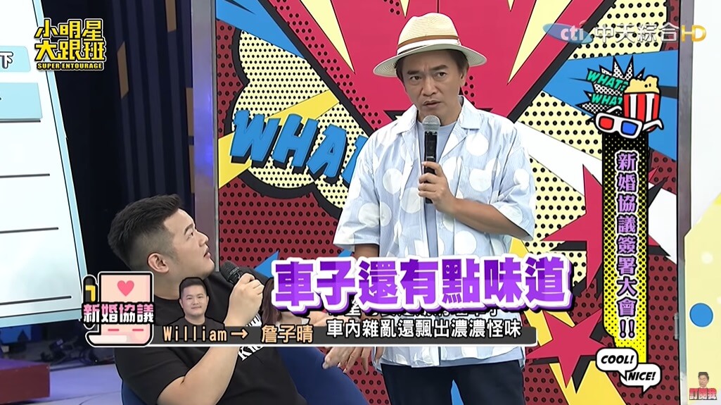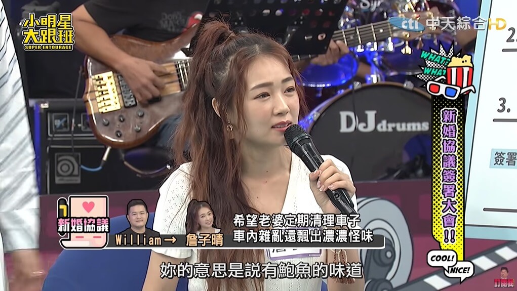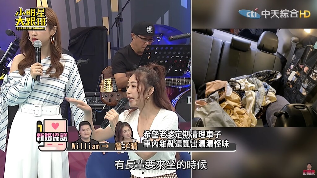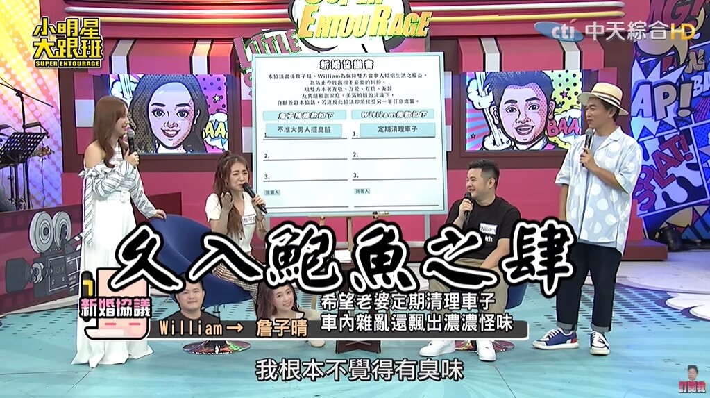 接著,王惟立也提出「希望老婆定期清理車子,因為車內雜亂到會飄出濃濃怪味」,Sandy在一旁聽了便默默的說,「久入鮑魚之肆」,讓憲哥驚訝的說,「你是說...有鮑魚味嗎?」讓現場所有來賓都笑翻。不過,丫頭則表示,車子是自己的車子,而且也沒有真的太亂,「我根本不覺得有臭味呀~」