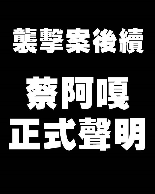 後續蔡阿嘎夫婦除將持續積極配合司法機關之審理程序外,也希望能夠在還原真相的同時,藉由司法機關之有效處置,遏止歪風。本公司及蔡阿嘎夫婦在此嚴正表明,對於此種傷及無辜婦幼之暴力攻擊行為,我們絕對採取零容忍的態度,一定會透過司法程序,捍衛應有的人身安全。最後,本公司及蔡阿嘎夫婦除再次感謝檢警的辛勞外,也真心期盼,不要再有無辜民眾遭人傷害。