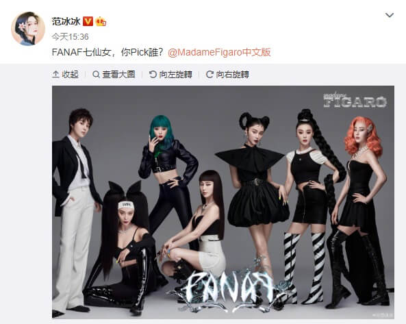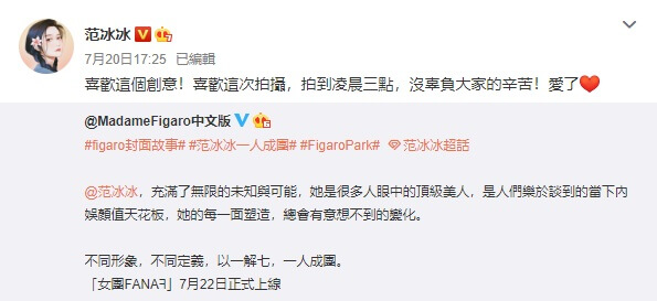 范冰冰最近在微博轉發了一系列時尚雜誌所拍攝的照片並寫道,「喜歡這個創意!喜歡這次拍攝,拍到凌晨三點,沒辜負大家的辛苦!」從轉發地內容中可以看到,對方在文案寫下,「充滿了無限的未知與可能,她是很多人眼中的頂級美人,是人們樂於談到的當下內娛顏值天花板,她的每一面塑造,總會有意想不到的變化!不同形象,不同定義,以一解七,一人成團」,還透露,這組「女團FANAᖷ」7月22日正式上線!