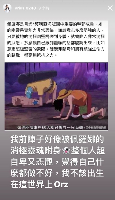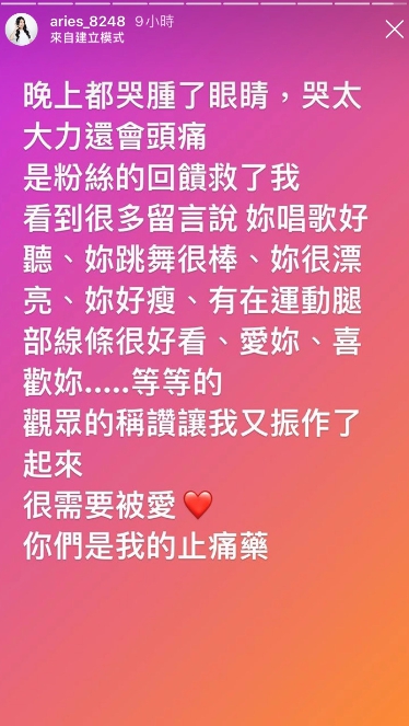 艾瑞絲經常在社群平台分享日常,近日她更新限時動態,提到自己前陣子似乎被消極靈魂附身,整個人非常地自卑又悲觀,覺得什麼事情都做不好,「我不該出生在這世界上Orz」。每天晚上艾瑞絲都將眼睛哭腫,甚至哭太用力導致頭痛,讓粉絲們十分心疼。