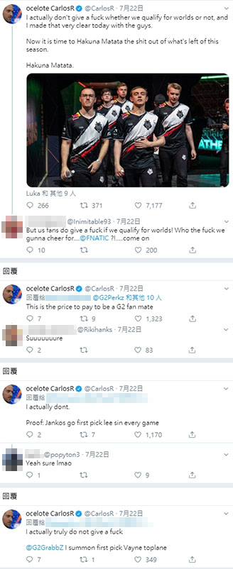 近日,G2戰隊接連兩天在賽場上失利,G2官方Twitter自嘲地發文:改名叫 G 0-2好了,22日時G2戰隊的老闆「Ocelote」在Twitter上幽默寫道:「我真的不在乎我們會不會進世界賽,我也跟選手們說得很清楚了。接下來的比賽就是為了好玩的!」,並對支持他們的粉絲喊話:「兄弟,這就是當G2粉絲的代價!」並指出他不在乎的關鍵證據:「Jankos選手每場都首選李星!並對總教練只是下場要首選汎來走凱薩路」,一連串反串似的搞笑回答也讓前來關心的粉絲捧腹大笑!