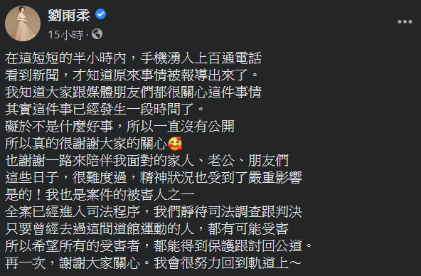 在事情爆發後,劉雨柔也在個人臉書PO文寫下,「其實這件事已經發生一段時間了。礙於不是什麼好事,所以一直沒公開,所以真的很謝謝大家的關心,也謝謝一路來陪伴我面對的家人、老公、朋友們,這些日子,很難度過,精神狀況也受到嚴重影響!」劉雨柔也提到,她只是案件的被害人之一,可以感受到受害者不只她一人,目前此案已進入司法程序,她只需要靜待結果,希望受害的人都能討回公道。