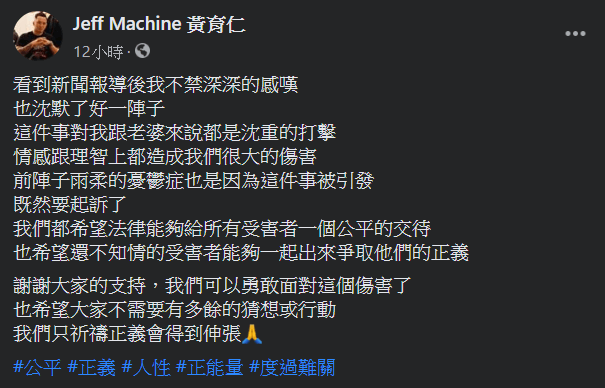 而老公黃育仁也出面護妻,在社群平台上發文寫道,「看到新聞我不禁深深感嘆,也沉默好一陣子,這件事對我跟老婆來說,都是沉重的打擊!情感跟理智上都造成我們很大的傷害,前陣子雨柔的憂鬱症也因這件事被引發!」希望這起案件都起訴了,法律上就應該要給受害者們交代,也呼籲不知情的受害者一起伸張正義,不希望大家自己進行多餘的揣測。