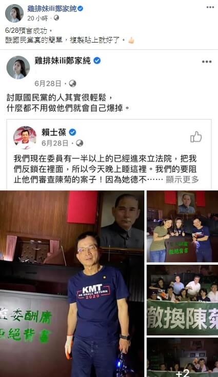 而雞排妹也特地翻自己在6月底的發文,並在貼文內容中寫道,「6/28預言成功~酸國民黨真的簡單,複製貼上就好了!」從雞排妹貼出的截圖中可以看到,當時她轉發了賴士葆的貼文,並在自己的貼文內容中寫下,「討厭國民黨的人其實很輕鬆,什麼都不用做他們就會自己爆掉!」