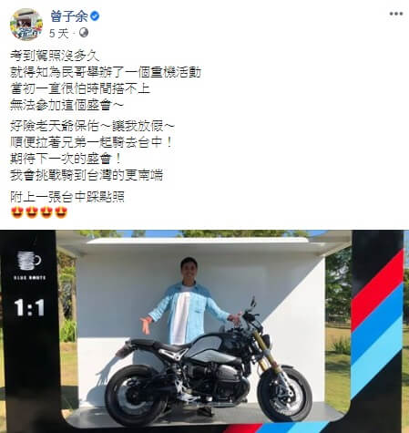 而根據《ETtoday》報導,曾子余最近偷偷買了一台重型機車,本來以為被媽媽發現之後可能會鬧出家庭革命,在告知媽媽前,他還反覆在心中排練了各種可能會發生的情況,甚至準備了10個理由要說服媽媽!沒想到,當他坦承時,媽媽竟淡定的說,「你都30歲了,這些也都是你努力得來的,不偷不搶,我很驕傲,注意安全就好!」讓曾子余感動不已,還說父親節快到了,到時候要載媽媽去北海岸兜風看夕陽。