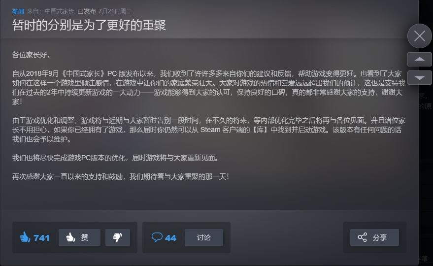 近日有網友爆料,在中國Steam上忽然發現《中國式家長》被下架!眾多玩家隨即看到官方在Steam平台上發布消息:「暫時的分別是為了更好的重聚。」但沒想到這次的優化竟然只有「中國地區」需要下架,雖然官方宣稱不久的將來會再與大家見面,但此次的消息也讓玩家十分擔憂,下一款消失的會是什麼?