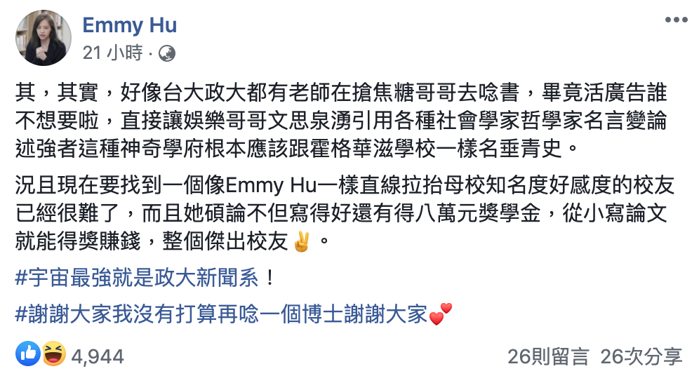 對此財經專家胡采蘋也在臉書爆料:「其,其實,好像台大政大都有老師在搶焦糖哥哥去唸書,畢竟活廣告誰不想要啦,直接讓娛樂哥哥文思泉湧引用各種社會學家哲學家名言變論述強者這種神奇學府根本應該跟霍格華滋學校一樣名垂青史。」