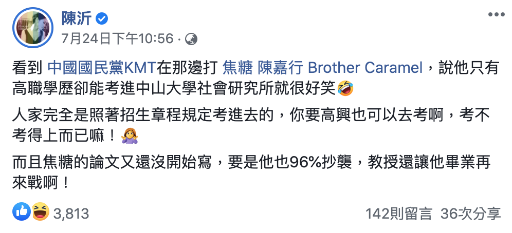 向來嗆辣敢言的網路名人陳沂也力挺焦糖哥哥:「說他只有高職學歷卻能考進中山大學社會研究所就很好笑,人家完全是照著招生章程規定考進去的,你要高興也可以去考啊,考不考得上而已嘛!而且焦糖的論文又還沒開始寫,要是他也96%抄襲,教授還讓他畢業再來戰啊!」