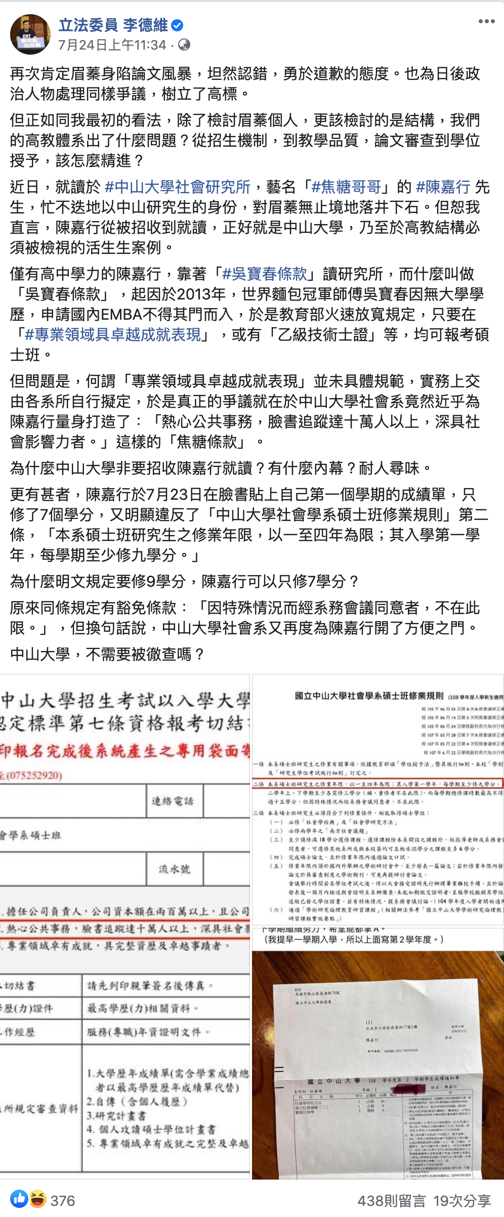 李德維指出焦糖哥哥明明只有高中學歷,卻能夠進入中山大學社科院讀研究所,是靠「吳寶春條款」所賜,然而該條款有註明必須具備「專業領域具卓越成就表現」才能入學,李德維認為焦糖哥哥只是靠著臉書有10萬人追蹤這個「卓越表現」就進入中山大學就讀,更點出中山大學有規定一學期至少需要修滿9學分,但焦糖哥哥只修了7學分,質疑中山大學為焦糖哥哥開了「焦糖條款」並表示:「中山大學,不需要被徹查嗎?」