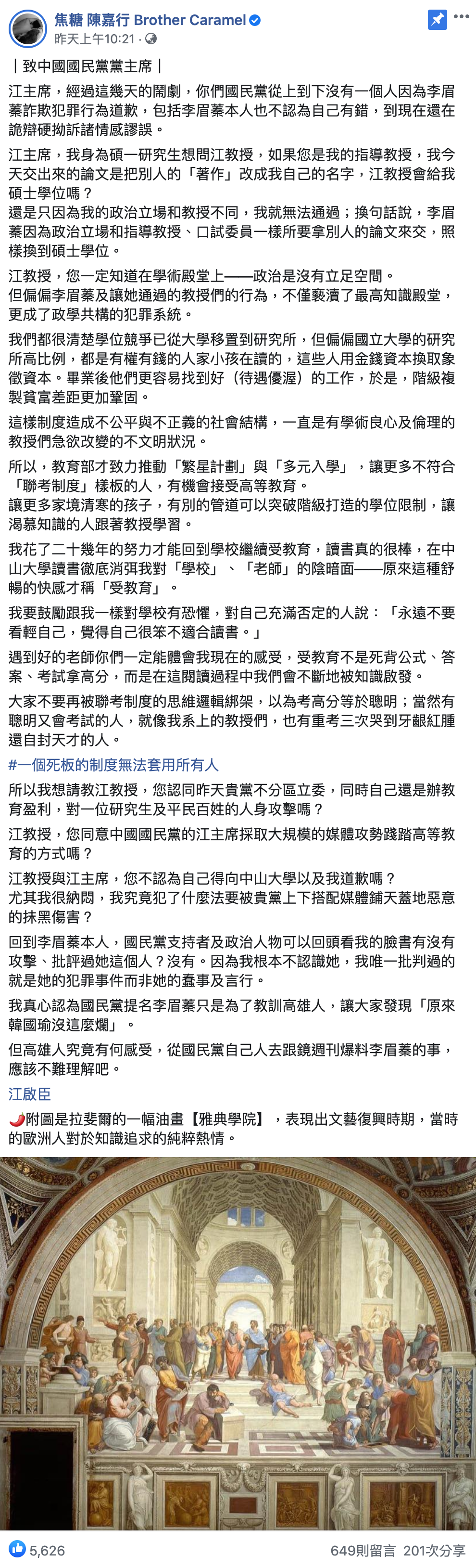 焦糖哥哥隨後在臉書po出千字文控訴國民黨抹黑造謠,直言:「我究竟犯了什麼法要被貴黨上下搭配媒體鋪天蓋地惡意的抹黑傷害?」他表示一個死板的制度無法套用所有人,透過多元管道入學回到學校唸書讓他感到很幸福,最後更不忘酸嗆:「我真心認為國民黨提名李眉蓁只是為了教訓高雄人,讓大家發現原來韓國瑜沒這麼爛。」
