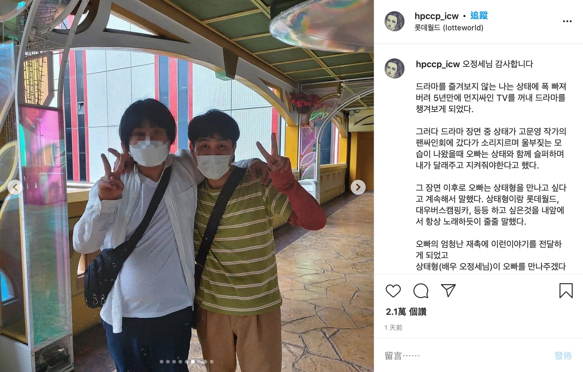 一名韓國網友昨日在IG上傳了吳政世與自己哥哥的合照,並寫下長文說明了吳政世與哥哥見面的來龍去脈。原來這名網友的哥哥患有精神障礙,看到劇中文尚泰在高文英的簽書會上崩潰大哭的場景後,也跟著尚泰一起感到悲傷,過後就一直向妹妹表示想要與尚泰見面、一起到遊樂園玩。妹妹透過關係將這件事傳達給吳政世後,沒想到對方竟然在繁忙的日程中答應赴約!