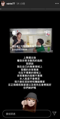 也有不少酸民的留言,讓楊丞琳看了忍不住在限時動態發文回覆說,「看到非常多酸民的指教,我想說,我在自己的專業領域上發揮的非常專業,也在不專業的領域上,非常專業的發揮不專業!本人就是不會煮菜,我只會吃苦耐勞跟賺錢養家,反正我媽和我婆婆以及我先生會煮就好,你們嫉妒嗎?」而鄭元暢也發文力挺好友,拒絕酸民們繼續攻擊。