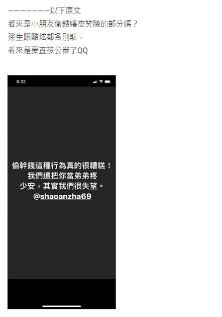 前陣子酷炫在限時動態中,公開批評反骨小地精「少安」,其中提到少安不僅偷酷炫的錢,甚至嬉皮笑臉,讓大家對少安感到十分失望,直呼這種行為很糟糕!限時動態發出沒多久後,酷炫就將該限動刪除,而這起事件也被轉發到Dcard上延燒。