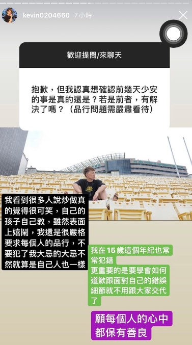 而近日酷炫開放網友問答,其中就有網友詢問「偷錢事件」的真偽,對此酷炫做出回應表示,「看到很多人說炒作真的覺得很可笑,自己的孩子自己教,雖然表面上嬉鬧,我還是很嚴格要求每個人的品行,不要犯了我大忌的大忌,不燃就算是自己人也一樣」!同時酷炫也補充,15歲這個年紀很常犯錯,但更重要的是學會道歉、面對自己的錯誤!
