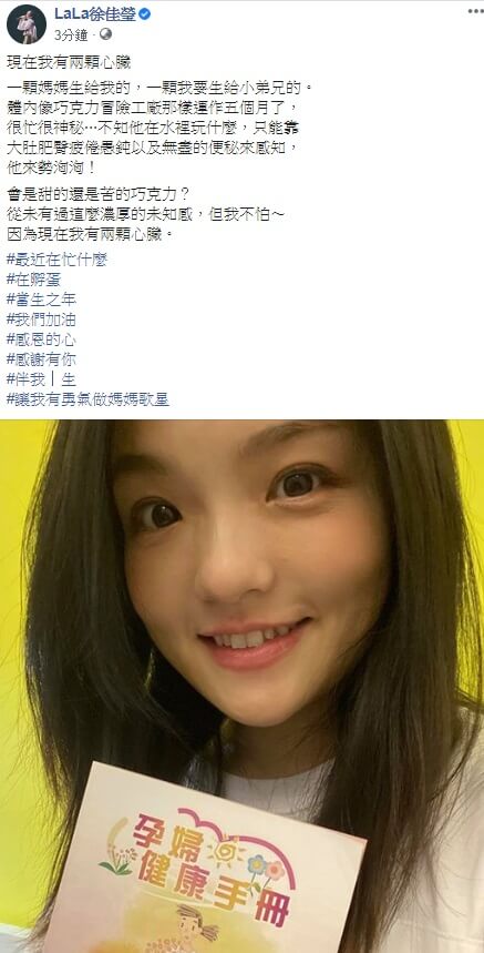 徐佳瑩27日突然在臉書發文曬出自己拿著「孕婦健康手冊」的照片,並在貼文內容中寫道,「現在我有兩顆心臟,一顆媽媽生給我的,一顆我要生給小弟兄的。體內像巧克力冒險工廠那樣運作五個月了,很忙很神秘...不知他在水裡玩什麼,只能靠大肚肥臀疲倦愚鈍以及無盡的便秘來感知,他來勢洶洶!會是甜的還是苦的巧克力?從未有過這麼濃厚的未知感,但我不怕~因為現在我有兩顆心臟」。