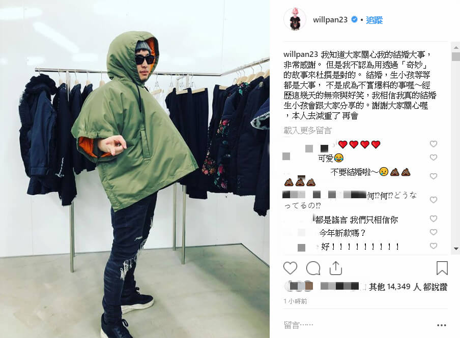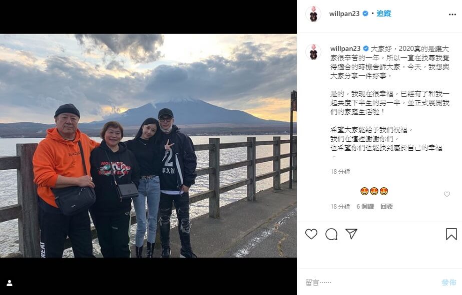潘瑋柏27日突然在IG發文寫下,「大家好,2020真的是讓大家很辛苦的一年,所以一直在找尋我覺得適合的時機告訴大家。今天,我想與大家分享一件好事!是的,我現在很幸福,已經有了和我一起共度下半生的另一半,並正式展開我們的家庭生活啦!」潘帥也希望大家可以給予祝福,「我們在這裡謝謝你們,也希望你們也能找到屬於自己的幸福」。
