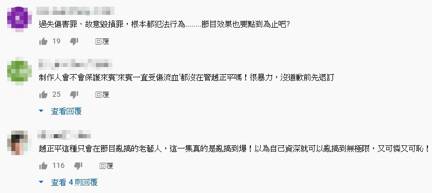 節目播出後,立刻引起關注,YouTube也有不少人留言批評,「東西打到別人牙齒流血一句道歉也沒說,只能靠資深壓人沒品又沒效果,還是別上節目了吧」、「把人家牙齒打流血,一句對不起都沒有!」、「趙正平這種只會在節目亂搞的老藝人,這一集真的是亂搞到爆!以為自己資深就可以亂搞到無極限」、「這集看的很不舒服,這個已經是當眾使用暴力而不是做效果了」、「一直霸凌來賓及主持人,好玩嗎?這種嘉賓能上節目,也是開眼界了」。