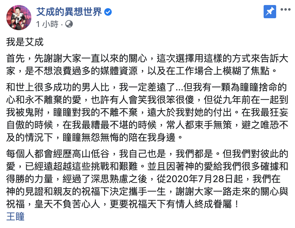 - 7月28日,艾成於臉書公布已與王瞳登記結婚,貼文中提到:「每個人都會經歷高山低谷,我自己也是,我們都是。但我們對彼此的愛,已經遠超越這些挑戰和艱難。並且因著神的愛給我們很多確據和得勝的力量,經過了深思熟慮之後,從2020年7月28日起,我們在神的見證和親友的祝福下決定攜手一生,謝謝大家一路走來的關心與祝福,皇天不負苦心人,更要祝福天下有情人終成眷屬!」