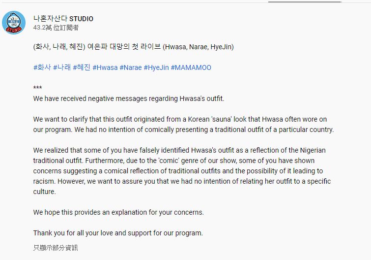 事實上,在電視台發出聲明後,底下也引來許多網友附和,認為藝人的一舉一動都被放大,為華莎抱屈。不過2017年時,MAMAMOO「塗黑臉」、戴黑人假髮致敬火星人布魯諾的行為,同時再被翻出!當時他們也曾經遭批種族歧視,不過經紀公司RBW以及《MAMAMOO》全員即火速道歉,讓事件順利落幕。