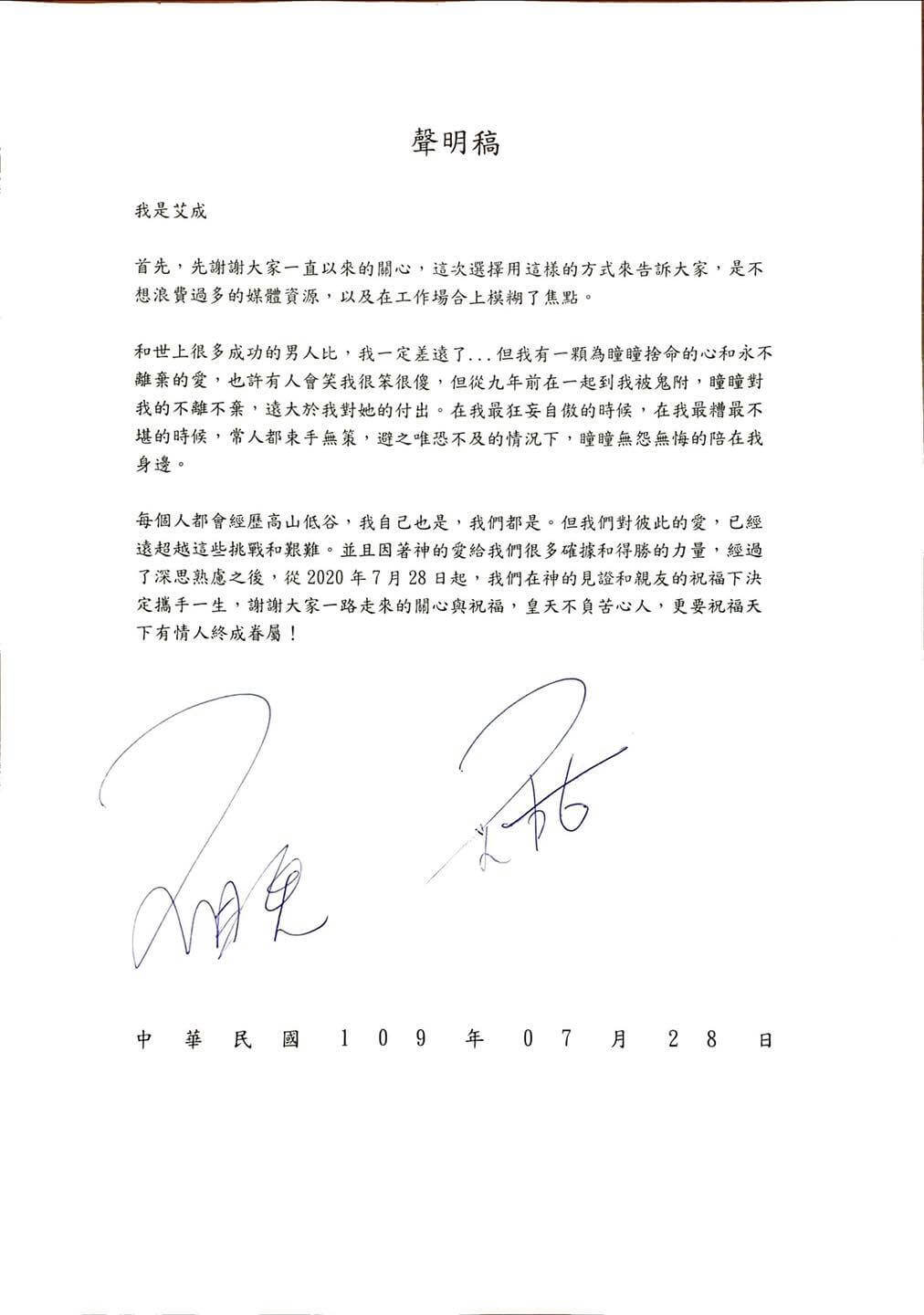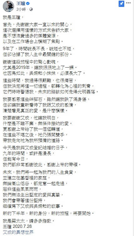 未來,我們將一起為我們的人生負責,並建立在基督裡的家庭,無論高山低谷,都定意一起走過,若非這些風風雨雨,我們無法生出堅定的愛與真摯,我們會帶著這份堅持,繼續寫下艾成與吳姍耘的故事。新的下半年,新的身份,新的旅程,將要開始。我是蔡太太,請多多指教。王瞳 2020.7.28
