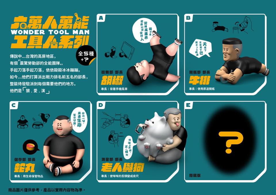 狠愛演日前與廠商合作推出獨家週邊商品,一曝光後就引起網友熱烈討論,因為他們的週邊商品竟然是「扭蛋」!這組名為「六萬人萬能工具人系列」的扭蛋一共有4款,將狠愛演的成員牛排、胡椒、蛇丸及老人與狗都化身成Q版公仔,除此之外每款公仔都具有一個兼具實用性的功能,分別是開瓶器、手機支架、小收納盒以及捲尺,商品推出後立刻讓粉絲們直呼超可愛!