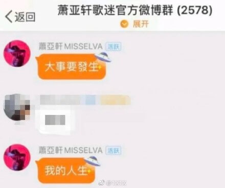蕭亞軒28日突然在歌迷官方微博群裡面跟粉絲們宣告「大事要發生」,便馬上有網友追問她怎麼了,她也接著說,「我的人生...,但遲早...不是好事,希望你們能了解我的朋友」。