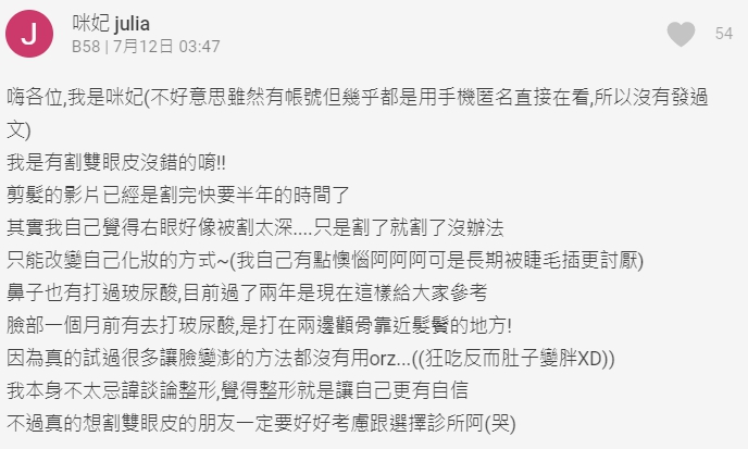 面對網友的疑問,咪妃本人也現身留言處,大方坦言自己有割雙眼皮,同時也解釋提到,一直以來常被睫毛弄到眼睛不舒服,因此請醫生將雙眼皮弄深,讓睫毛往上不會再弄到眼睛。另外咪妃也認為,右眼被割得太深,不過已經割了也沒辦法,只能改變自己的化妝方式,「想跟雙眼皮的朋友,一定要好好考慮跟選擇診所啊!」。