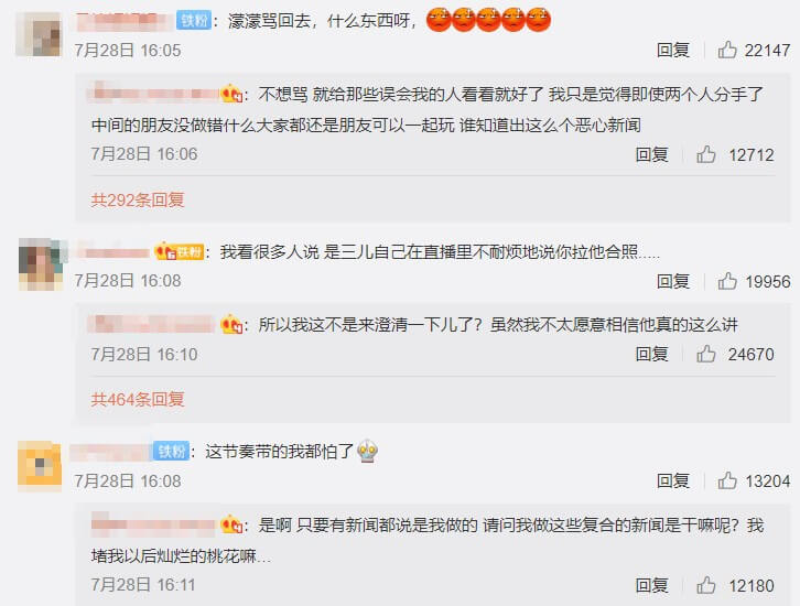 而周揚青也針對自己跟三兒合照的事感到很無奈,因為在網路上網友們謠傳「是周揚青主動貼過去找羅志祥的哥兒們合照」,讓她忍不住發聲,並且在微博小號貼出聊天紀錄澄清說,「我只是覺得,即使兩個人分手了,中間的朋友沒做錯什麼,大家都還是朋友可以一起玩,誰知道出這麼個噁心新聞!」直接打臉網友們的「復合說」。
