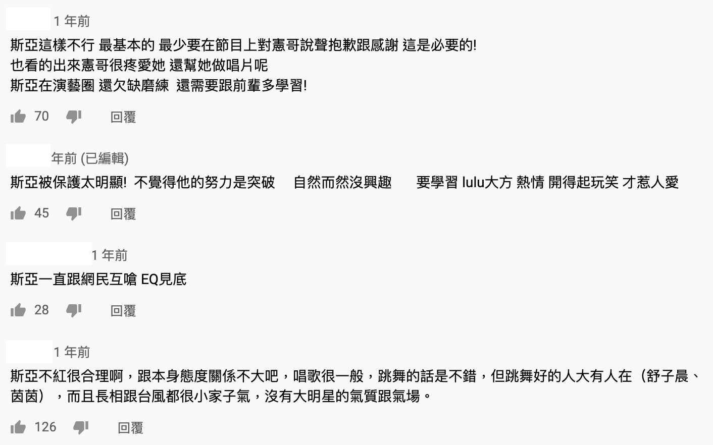 斯亞立刻解釋她有準備要去演出,也已經取消原本要跟媽媽吃飯的行程,但她表示公司「可能太忙,最後沒有cue我去」,所以才沒有去表演。憲哥最後終於消氣,並叫斯亞「過來給憲哥抱一下」,以溫暖的擁抱在節目現場大和解,讓斯亞感動到眼眶泛淚。不過節目播出後有許多網友認為斯亞的態度不佳,認為她「被保護太明顯」、「不紅很合理」、「最少要在節目上跟憲哥說聲抱歉」。