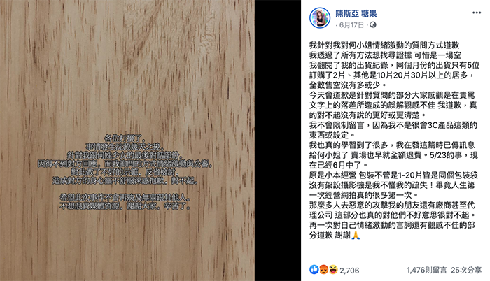 斯亞過後強調是對方態度先不好才會這樣回覆,更在IG po文透露當賣家的心酸表示:「我現在不是用公眾人物立場 我是用一個辛苦經營自己賣場的賣家在為自己發聲!」但風波並未因此平息,最後她才坦言:「因得不到對方的回應,而我詢問的方式情緒激動與公審,對此做了不好的示範,反省檢討」為自己的行為向買家道歉,才總算讓事情告一段落。