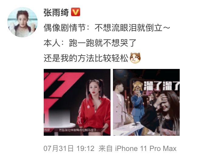 後來受訪時張雨綺表示:「我怕我哭在舞台上,我不要掉眼淚」,更坦言是看到同隊中腳受傷的鄭希怡也很難過,但不想讓悲傷的氣氛留在台上才會先跑下台,最後不忘逗趣表示:「但我跑一跑又不想哭了,因為我發現後面還有一個表演沒弄完。」過後張雨綺也在微博發文說偶像劇情節是「不想哭就倒立」,她是「跑一跑就不想哭了」,還是她的方法比較輕鬆。粉絲們也為她加油打氣:「你真的很棒」、「希望你想哭就哭,太心疼了」、「不哭不哭」
