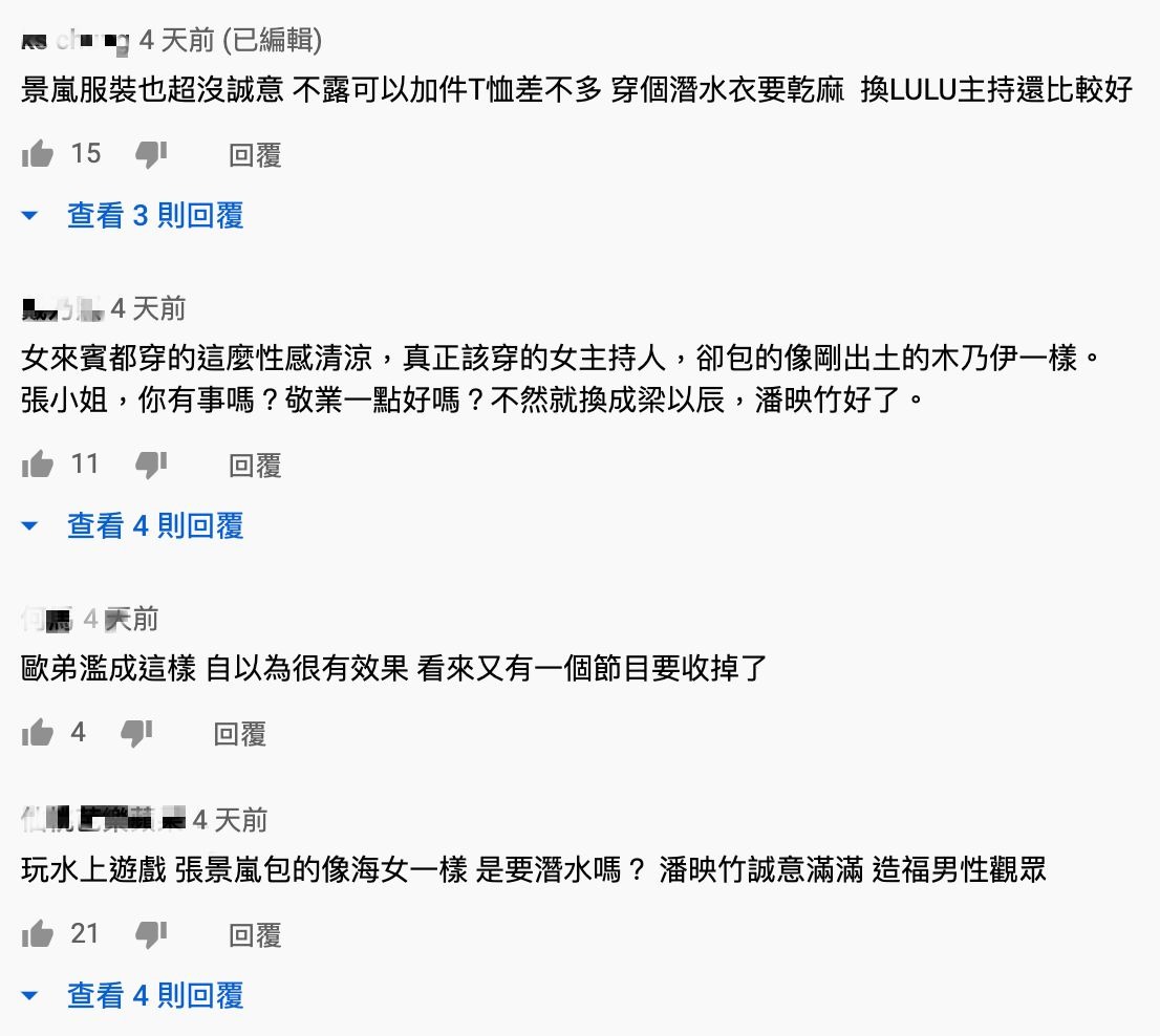 在26日播出的最新內容中,節目組來到高雄的義大世界進行遊戲競賽,配合夏日主題,其中一個環節也讓主持人與來賓進行了許多水上遊戲。只見女來賓都穿著比基尼等清涼火辣的服裝,但是身為唯一一位女主持人的張景嵐卻全身「包緊緊」,全身都穿著長袖長褲的潛水服,讓網友忍不住批評:「是要去潛水嗎?」、「超沒誠意」。