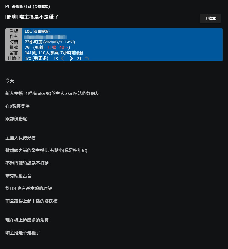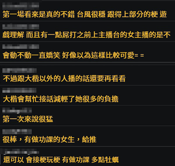 PTT文章一出,立刻引起許多粉絲留言討論,「第一場看來是真的不錯,台風很穩 跟得上部分的梗,遊戲理解比起以前的女主播更好。」、「大楷會幫忙接話減輕了她很多的負擔。」、「很棒,有做功課的女生,給推!」、「還可以,她會接梗玩梗,而且有做功課,多點牡蠣!」