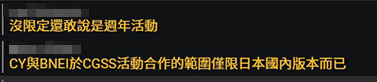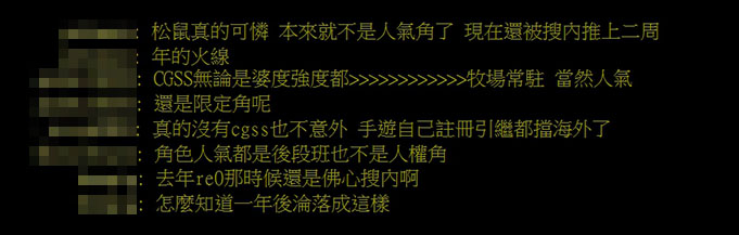 許多老玩家紛紛在底下留言表示,「松鼠真的可憐,本來就不是人氣角了,現在還被搜內推上二周的火線!」、「CGSS無論是婆度強度都大於牧場常駐,而且還是限定角呢!」、「真的沒有cgss也不意外,日版手遊那邊註冊引繼都擋海外了。」、「角色人氣都是後段班也不是人權角。」、「去年re0那時候還是佛心搜內啊,怎麼知道一年後淪落成這樣⋯」、「沒限定還敢說是週年活動!」、「CY與BNEI於CGSS活動合作的範圍僅限日本國內版本而已。」