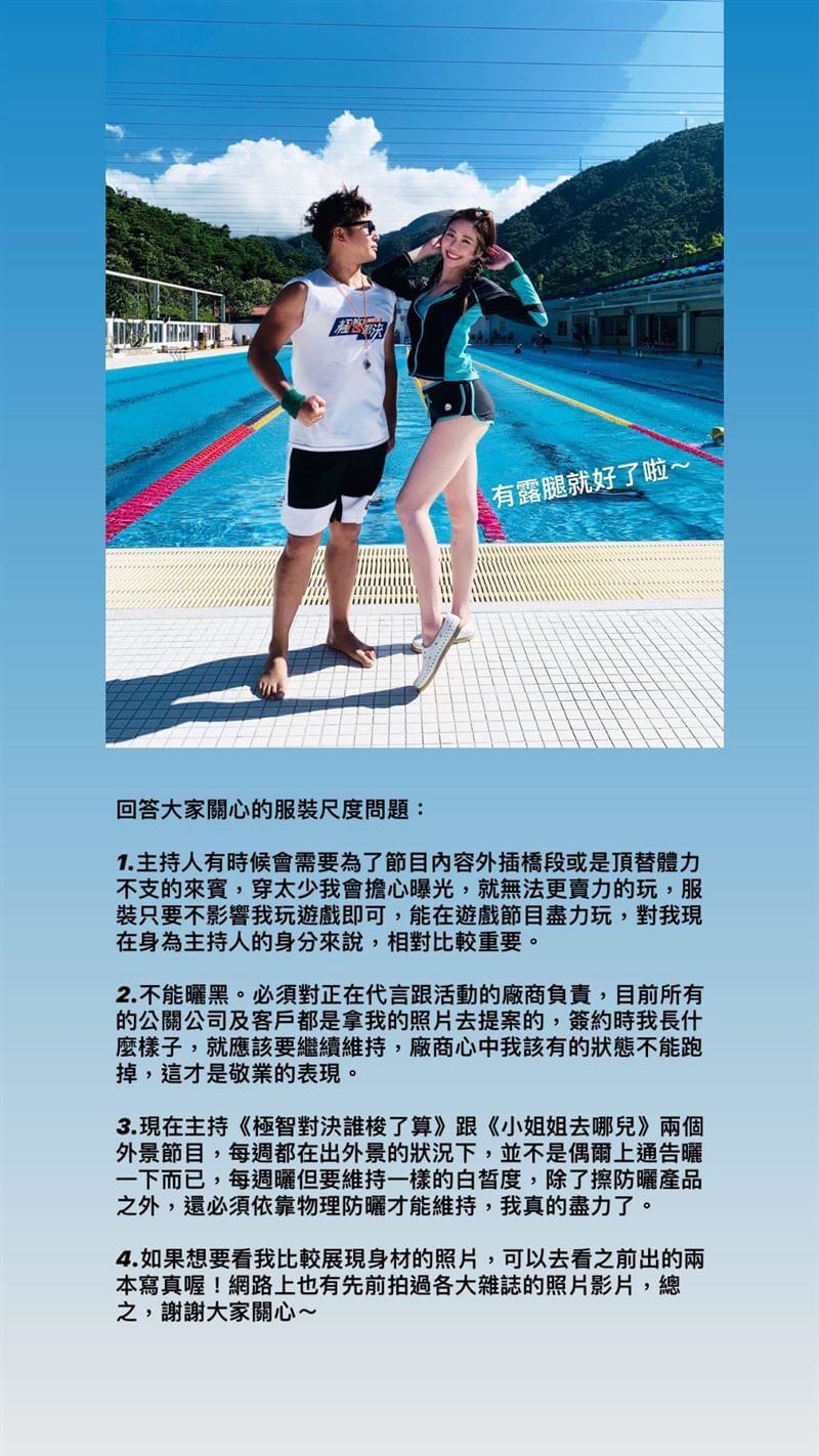 後來,張景嵐也在社群平台上發文曬出自己跟歐漢聲的照片並回覆大家關心的服裝尺度問題,「主持人有時會需要為了節目內容外插橋段,或是頂替體力不支的來賓,穿太少我會擔心曝光,無法賣力玩,服裝只要不影響玩遊戲即可,能在節目盡力玩遊戲,對我身為主持人的身分來說,比較重要!」