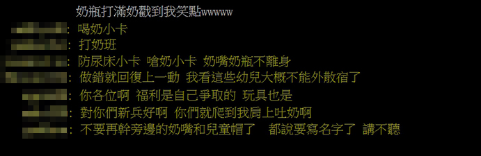 消息一出,引起許多網友前來朝聖且搞笑地留言,「奶瓶打滿奶戳到我笑點wwww」、「喝奶小卡!」、「做錯就回復上一動,我看這些幼兒大概不能外散宿了XD」、「防尿床小卡、嗆奶小卡,奶嘴奶瓶不離身!」、「上一動!」、「打奶班~」、「你各位啊~福利是自己爭取的,玩具也是!」、「對你們新兵好啊,你們就爬到我肩上吐奶啊。」、「不要再幹旁邊的奶嘴和兒童帽了 ,都說要寫名字了,講不聽!」