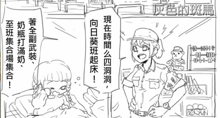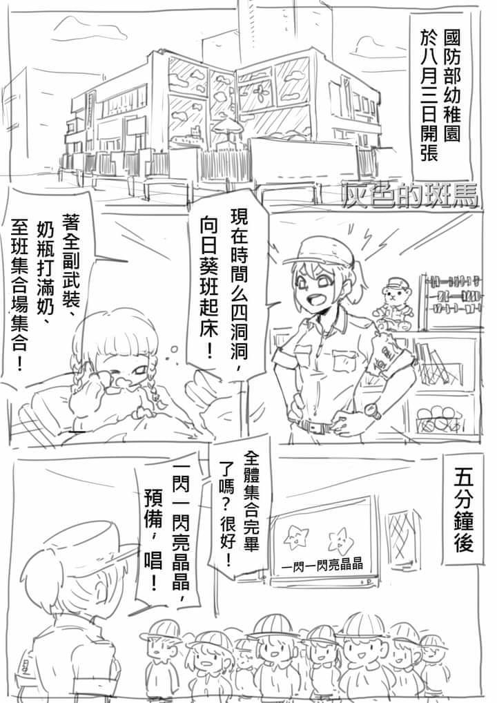 國軍幼兒園即將開辦時,許多網友詼諧地將孩童們的學校教育和軍中訓練串聯在一起,今日工作室「灰色的斑馬」將這些逗趣反應畫成單頁短漫,並被網友發現轉貼至PTT上,當過兵的人紛紛模仿起當兵時的口吻來回應貼文,讓許多網友不禁嘴角失守。