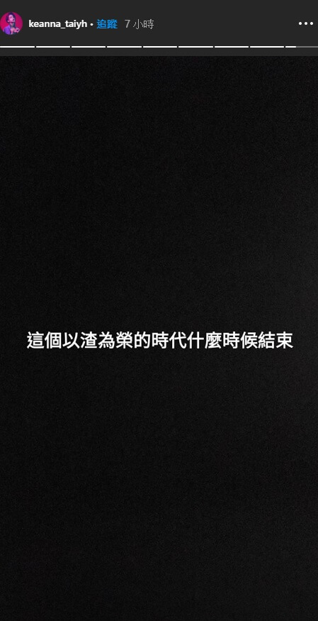 Keanna最近在IG的限時動態中突然以全黑底發文寫道,「這個以渣為榮的時代什麼時候結束」,讓不少網友們看了都覺得非常驚訝,因為前一晚她還跟朋友們開開心心的吃麻辣鍋,還去KTV唱歌、吃水餃,不料會突然發出一則這樣的貼文,讓粉絲們都相當關心她!
