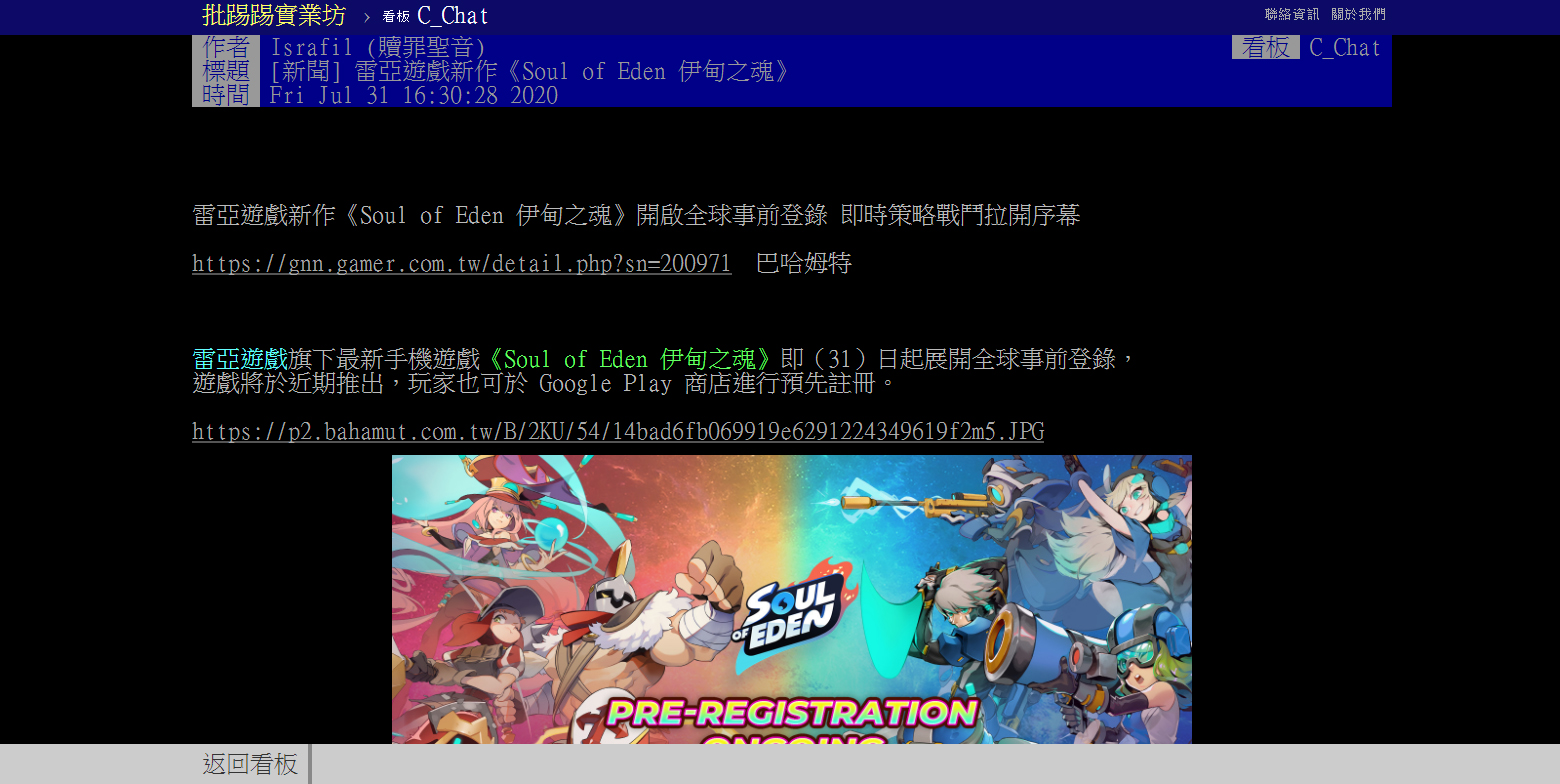 《Soul of Eden 伊甸之魂》是由台灣知名遊戲公司「雷亞」所開發,是一款即時戰略的卡片對戰遊戲,日前雷亞在全球展開事前登陸活動,完成活動後即可搶先獲得傳說卡牌。消息一在PTT上公開,卻引來許多玩家的嘲諷,倒文的評論不斷襲來。